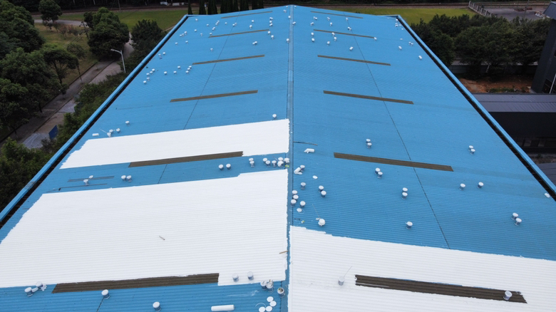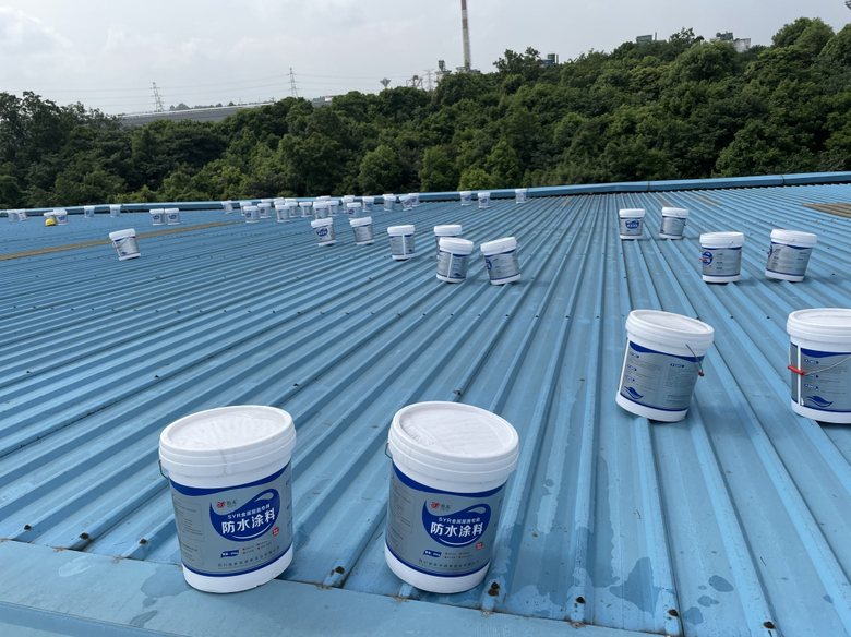 我公司根據(jù)現(xiàn)場實際情況,制定的方案是,采用SYR金屬屋面專用防水涂料配合專用的縫織聚酯布,涂刷多遍SYR金屬屋面專用防水涂料并中間鋪設(shè)聚酯布的方式進(jìn)行防水施工,采用此工藝施工的防水工程是專門針對彩鋼頂?shù)耐饴缎臀蓓數(shù)姆绞剑琒YR金屬屋面專用方式涂料施工后具有防水、反射隔熱降溫、耐酸性腐蝕、耐氣候老化多種功能。表面無需做保護(hù)層依然可確保防水層的耐久使用壽命。