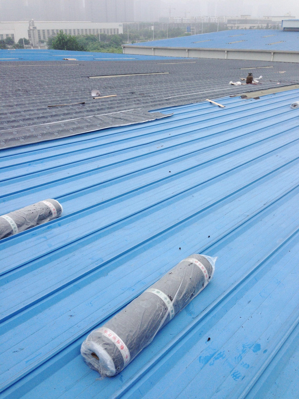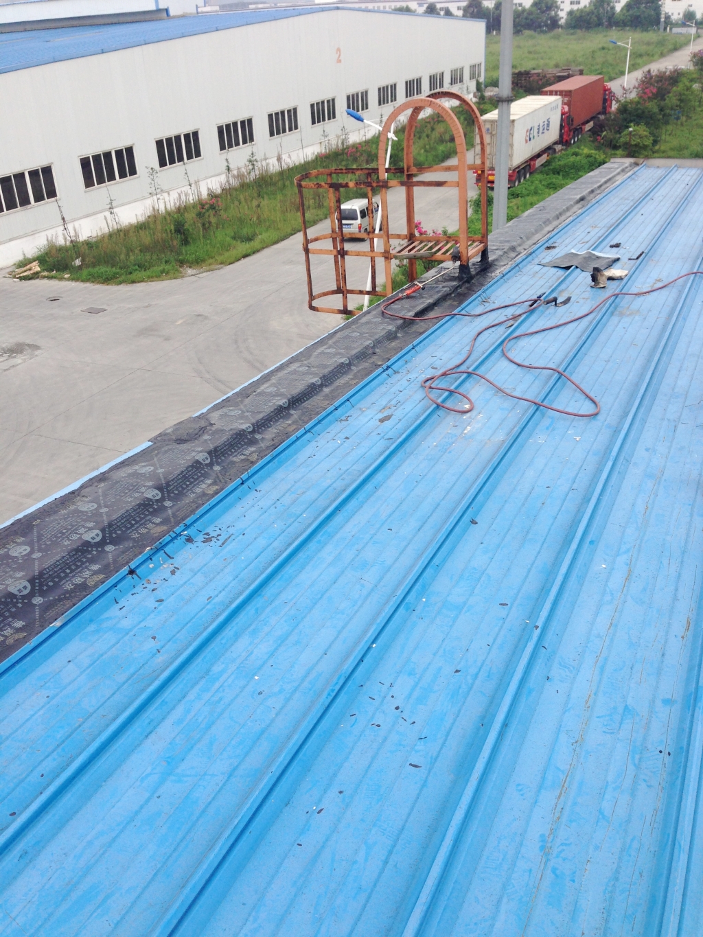 彩鋼瓦屋頂經(jīng)過(guò)幾年的風(fēng)吹雨打,表面油漆容易掉落,油漆掉落后表面很快就會(huì)出現(xiàn)銹跡斑斑,個(gè)別地方彩鋼瓦就會(huì)銹穿孔,導(dǎo)致漏水,滿鋪一層改性瀝青防水卷材,不但能夠起到防水作用,而且保護(hù)了彩鋼瓦,使彩鋼瓦的使用壽命延長(zhǎng),所以此工程我們采用漏水區(qū)域頂全全做一層SBS改性瀝青防水卷材的方法。